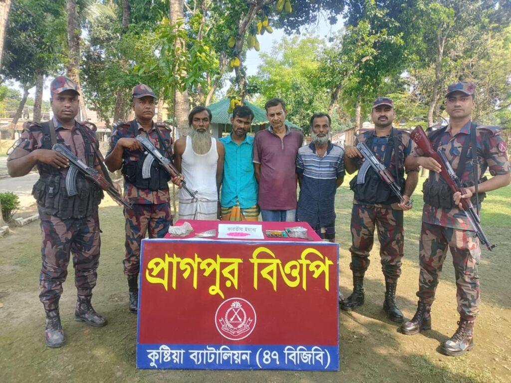 বিজিবি জানায়, উপজেলার প্রাগপুর এলাকায় সীমান্ত পিলার ১৪৮/২-এস হতে ৬শ’ গজ বাংলাদেশের অভ্যন্তরে মৃত আব্দুল গণির ছেলে মাদক চোরাকারবারী সোহেল রানার বাড়িতে অভিযান করে ৩শ’ পিচ ইয়াবাসহ তাকে আটক করে। এ সময় মাদক সেবনকারী প্রাগপুর গ্রামের মৃত আরমান আলীর ছেলে রফিকুল ইসলাম (৫০), রহিম মন্ডলের ছেলে শাহাদাত হোসেন (৪০), ভেগলের ছেলে মিলন হোসেনকে (৪২) আটক করে।